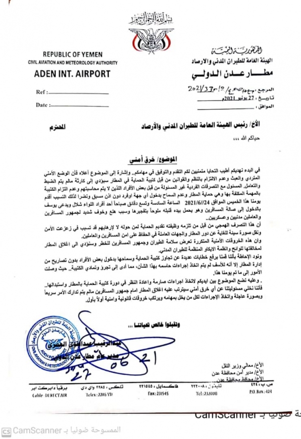 جاء ذلك في رسالة شكوى رفعتها إدارة مطار عدن إلى رئيس الهية العامة للطيران المدني والإرصاد، حصل "يمن شباب نت"، على نسخة منها.
