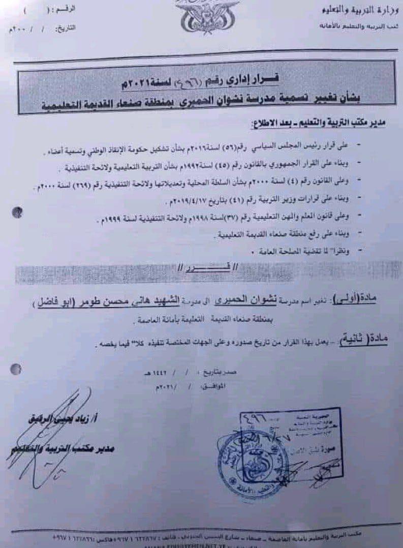 وقرر "الرفيق" تغيير اسم مدرسة "نشوان الحميري" إلى مدرسة "الشهيد هاني محسن طومر"، وهو أحد عناصر الحوثي الذين قتلوا مؤخراً شرقي محافظة الجوف، وينتمي لمحافظة صعدة.