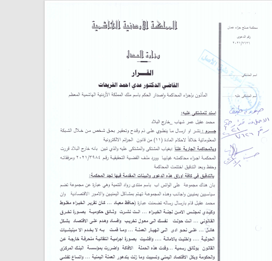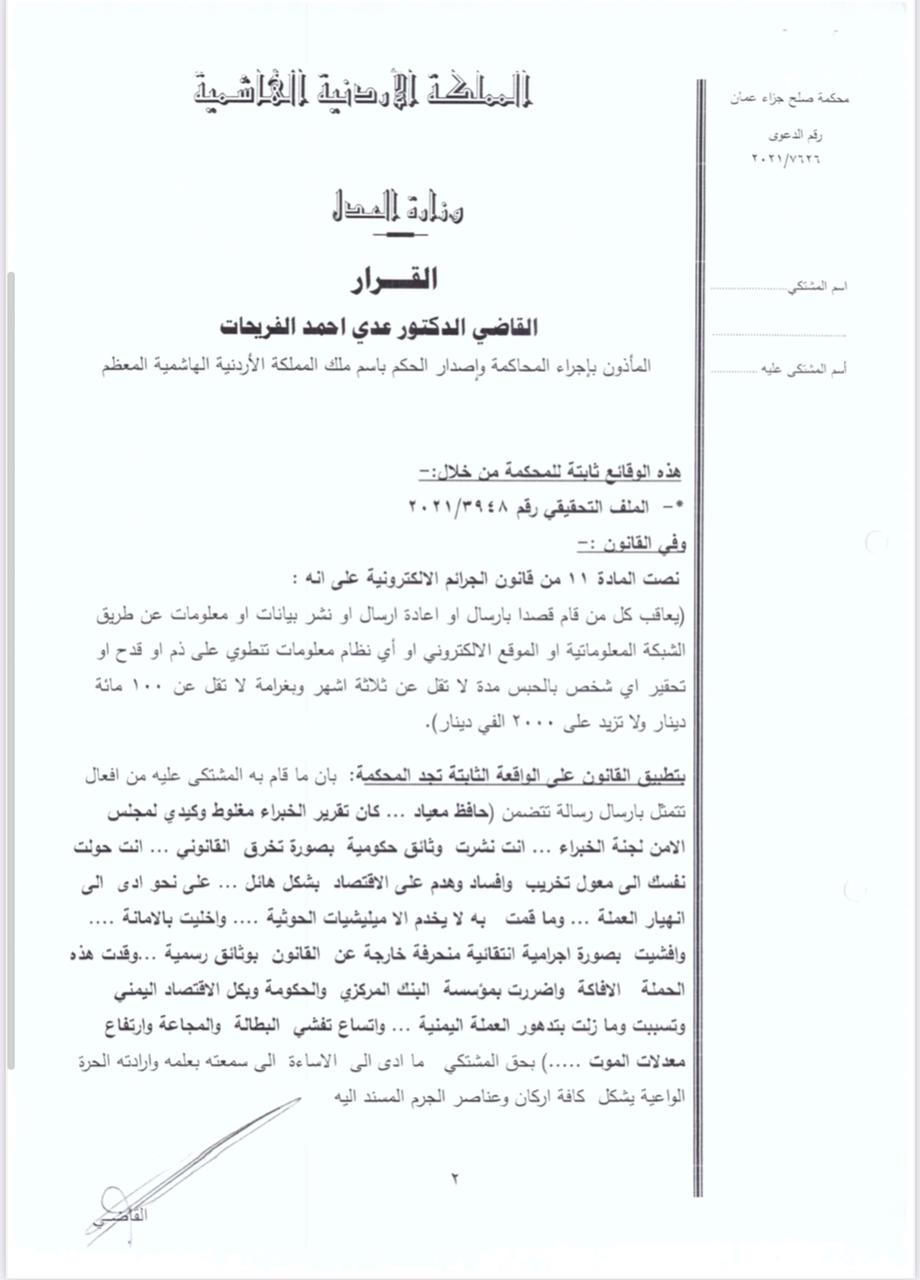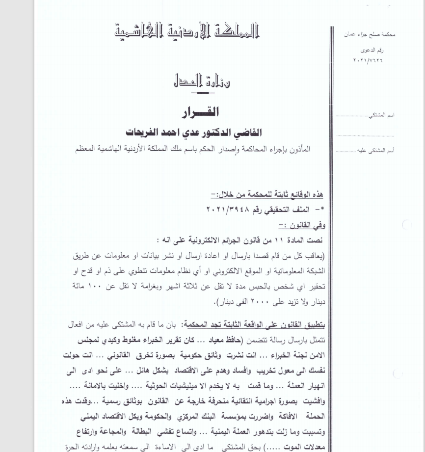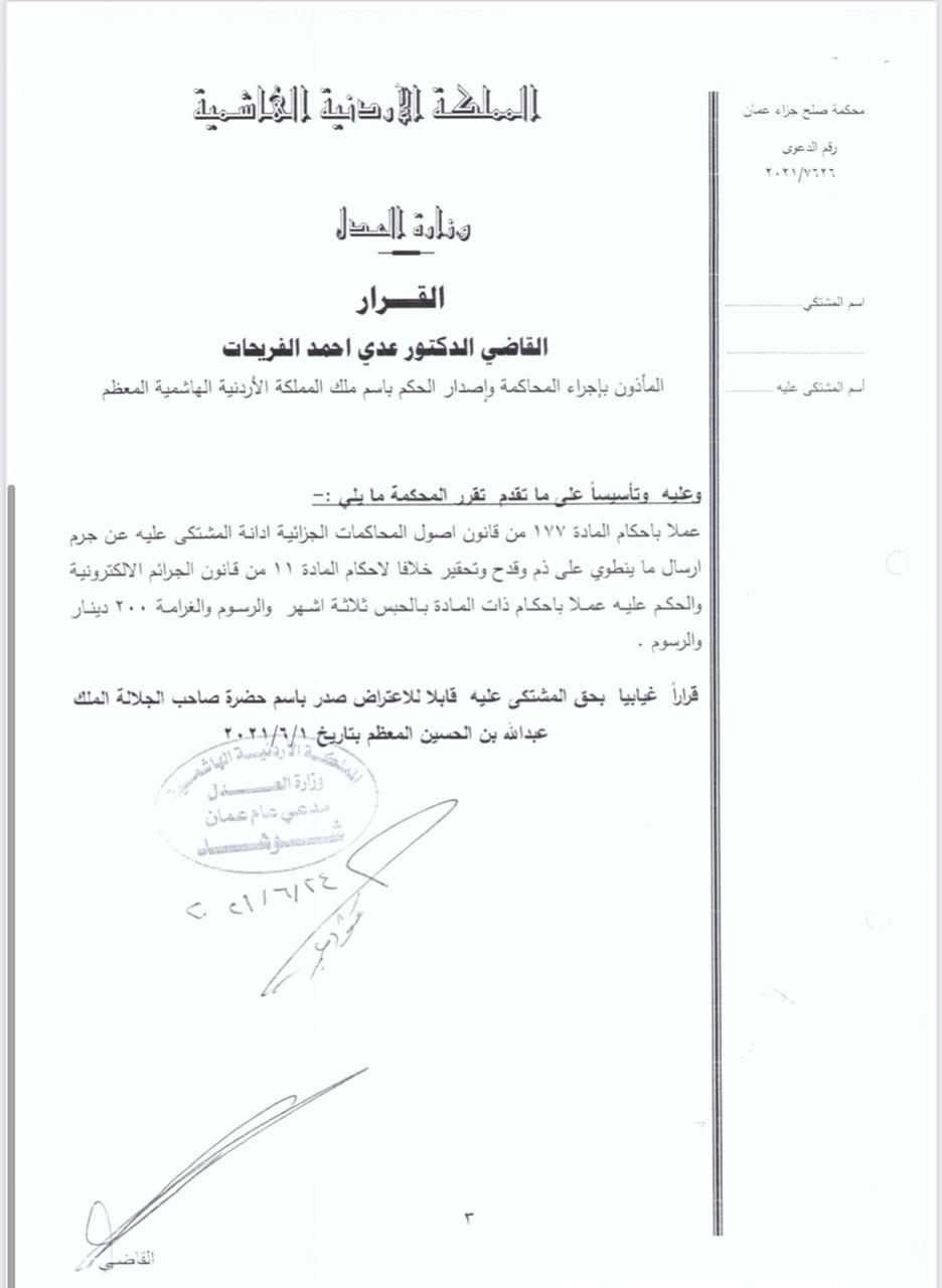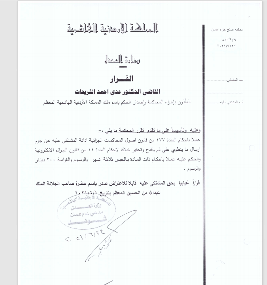 ونص منطوق الحكم الصادر من محكمة صلح جزاء عمان، بمعاقبة المتهم "شهاب" بالحبس ثلاثة أشهر وتغريمه 200 دينار والرسوم، بعد ادانته بجرم ارسال ما ينطوي على ذم وقدح وتحقير بالمخالفة للمادة 11 من قانون الجرائم الالكترونية.