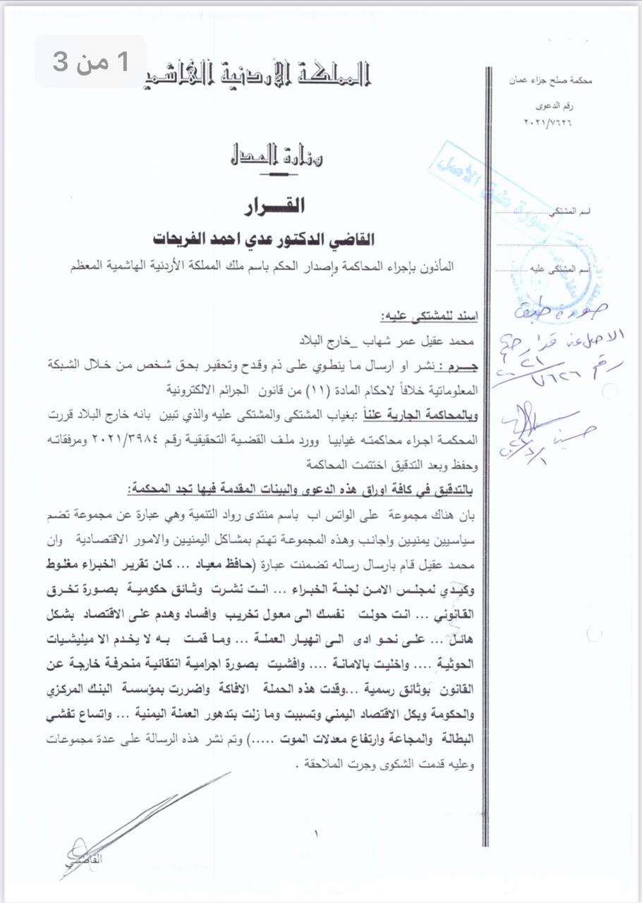 وأشارت حيثيات الحكم الصادر في نهاية يونيو الماضي، إلى أن شهاب أرسل رسائل عبر الواتس في جروب باسم منتدى رواد التنمية الذي يضم سياسيين يمنيين وأجانب، وتضمنت الرسالة إساءة إلى سمعة المدعي، معتبرة ذلك جرماً يستحق العقاب.
