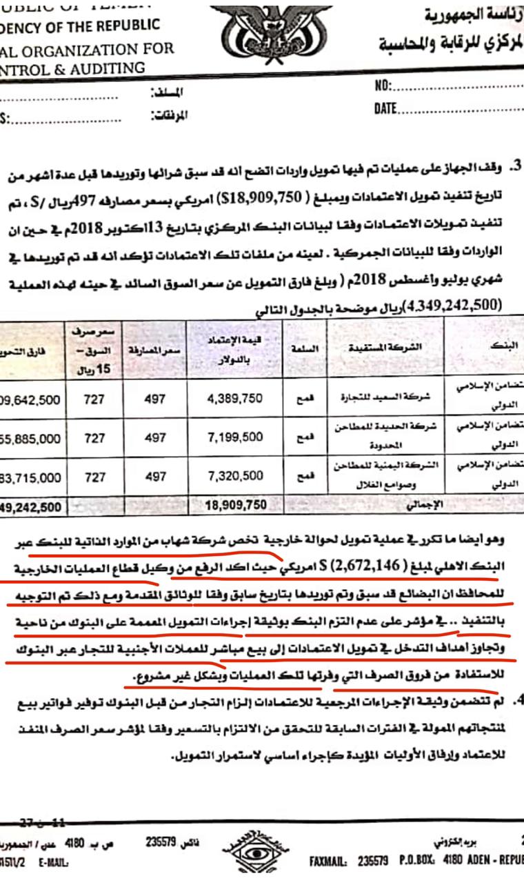 ويعد محمد شهاب من رجال الأعمال المقربين من رئيس الوزراء معين عبدالملك وقد أدانه تقرير صادر عن الجهاز المركزي للرقابة والمحاسبة بالاستفادة من الوديعة السعودية بأثر رجعي حيث حصل على تمويل لاستيراد بضائع سبق توريدها بتاريخ سابق وفقا للوثائق المقدمة ومع ذلك تم التوجيه بالتنفيذ ومنحه التمويل في مؤشر على عدم التزام البنك بوثيقة اجراء التعميم على البنوك من ناحية وتجاوز أهداف التدخل في تمويل الاعتمادات الى بيع مباشر للعملات الاجنبية للتجار عبر البنوك للاستفادة من فروق الصرف التي وفرتها تلك العمليات وبشكل غير مشروع.