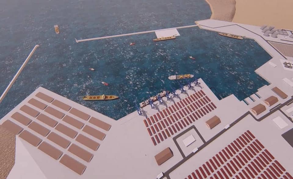 وتشمل المنشآت البحرية: "كاسر أمواج رئيسي ورصيف حاويات وحوض دوران ورصيف نفطي وقناة ملاحية وأرصفة خدمات وورش ورصيف متعدد الأغراض ورصيف دحروجة وكاسر أمواج ثانوي والفنار ومنزلقات صيانة".