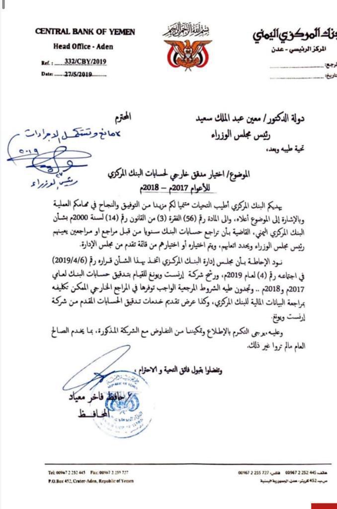 وكان اعلان رئيس الحكومة تعيين شركة إرنست أند يونغ بناء على رسالة محافظ البنك المركزي السابق حافظ معياد في شهر مايو 2019م بناء على قرار ترشيح مجلس إدارة البنك للشركة بحسب الوثيقة المرفقة.