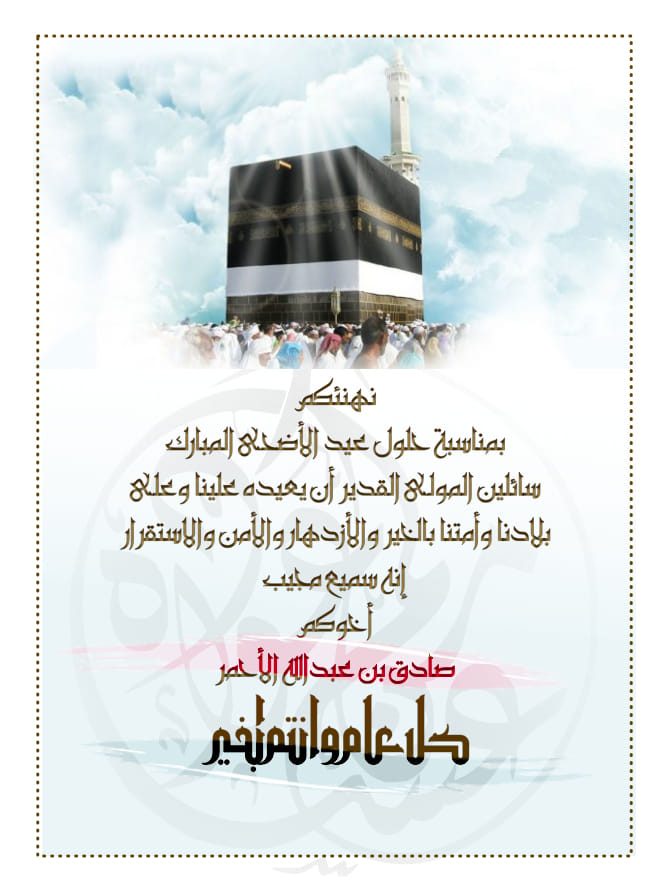هنأ الشيخ صادق بن عبدالله بن حسين الأحمر الشعب اليمني والأمتين العربية والإسلامية بحلول عيد الأضحى المبارك.