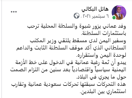 وأكد البكالي أن هذه التحركات العمانية تشير إلى ثمة رغبة عمانية في الدخول على خط الأزمة اليمنية سياسياً واقتصادياً بعد سنين من التزام الصمت حول ما يجري في البلاد.