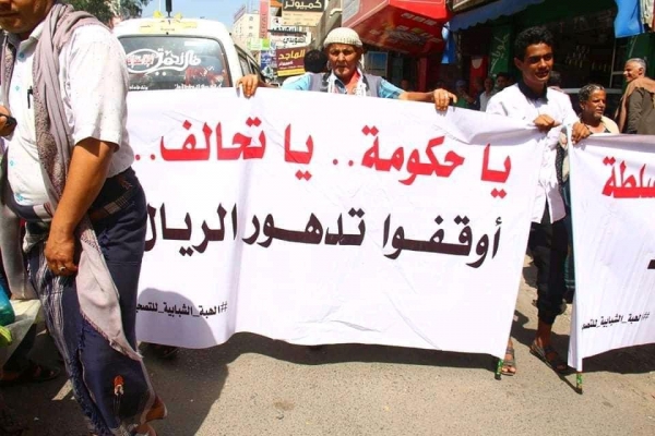 وتشهد عدة مدن يمنية، احتجاجات متواصلة تنديدا بانهيار العملة وتردي الخدمات والارتفاع الكبير في أسعار المواد الغذائية جراء التدهور غير المسبوق في تاريخ الريال اليمني.