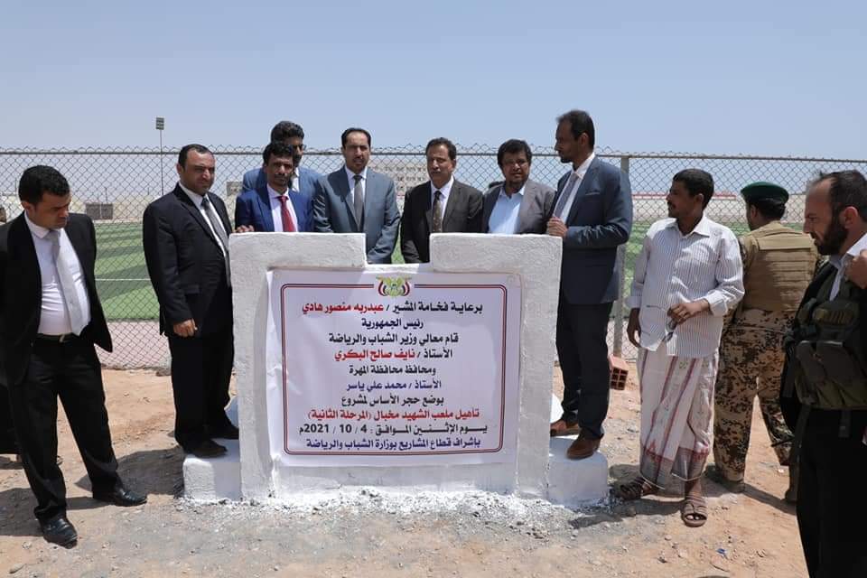 وضع معالي وزير الشباب والرياضة الأستاذ نائف صالح البكري ومعالي الأستاذ محمد علي ياسر محافظ محافظة المهرة - رئيس المجلس المحلي، اليوم، جحر الأساس لمشروع تأهيل ملعب الشهيد مخبال بمدينة الغيضة "المرحلة الثانية" الذي يُنفذ تحت إشراف قطاع المشاريع بوزارة الشباب والرياضة.