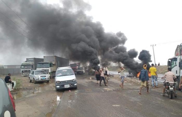 قطع العشرات من المحتجين اليوم الاثنين في منطقة العند التابعة لمديرية تبن في محافظة لحج جنوبي البلاد، الطريق الرئيسي المؤدي إلى العاصمة المؤقتة عدن لليوم الثاني على التوالي، احتجاجا على استمرار تدهور سعر العملة المحلية وارتفاع أسعار المواد الغذائية التي أدت إلى تردي الوضع المعيشي وفقاً للمحتجين.