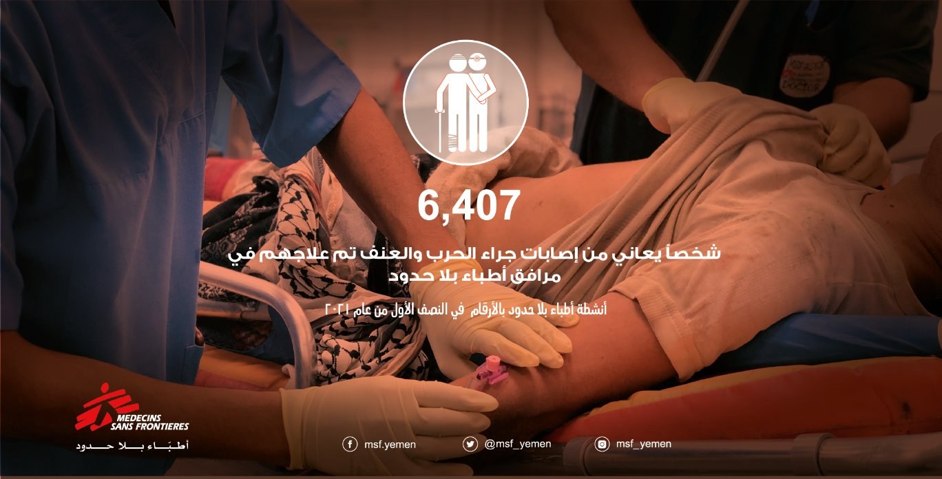قالت منظمة "أطباء بلا حدود"، مساء أمس الإثنين، إنها عالجت أكثر من ستة آلاف جريح جراء الحرب في اليمن خلال النصف الأول من 2021.