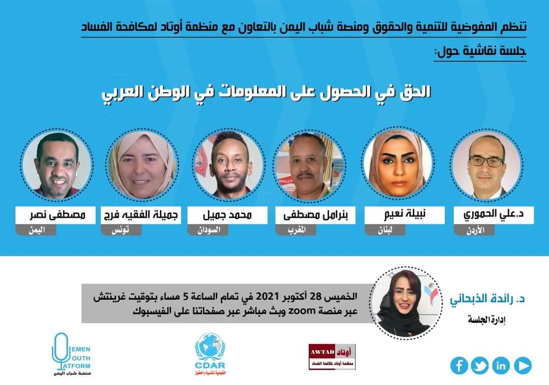 نظمت المفوضية للتنمية والحقوق بالتعاون مع منصة شباب اليمن ومنظمة أوتاد لمكافحة الفساد جلسة نقاشية حول: الحق في الحصول على المعلومات في الوطن العربي بمشاركة كوكبة من الاستشاريين والخبراء العرب والحقوقيين والصحفيين والباحثين من عدة دولة عربية.