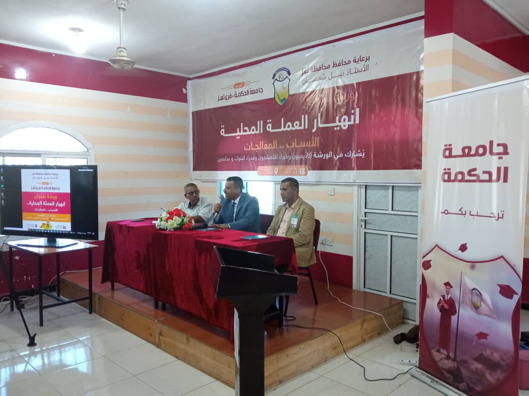 رئيس جامعة الحكمة "عبده محمد الكليبي" ، أكد أن مثل هذه الورش، ستعمل على تدارس اسباب انهيار العملة واقتراح اليات وطرق للحد من ذلك والتقدم بها للسلطة المحلية في المحافظة ومنها الى الحكومة الشرعية ممثلة برئيس وزرائها الدكتور معين عبدالملك .