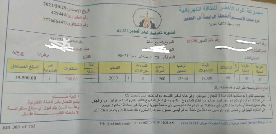 وتتفاوت أسعار الكهرباء التجارية من محطة لأخرى، فيما تصل في حدها الأدنى عند ثلاثمائة ريال للوحدة الكهربائية الواحدة، فيما تتفاوت أيضا رسوم الاشتراك الشهري ما بين ألف وخمسمائة ريال وألفين وخمسمائة ريال، وسط سوء الأوضاع الاقتصادية للمواطنين بفعل الانقلاب والحرب التي تشهدها البلاد.