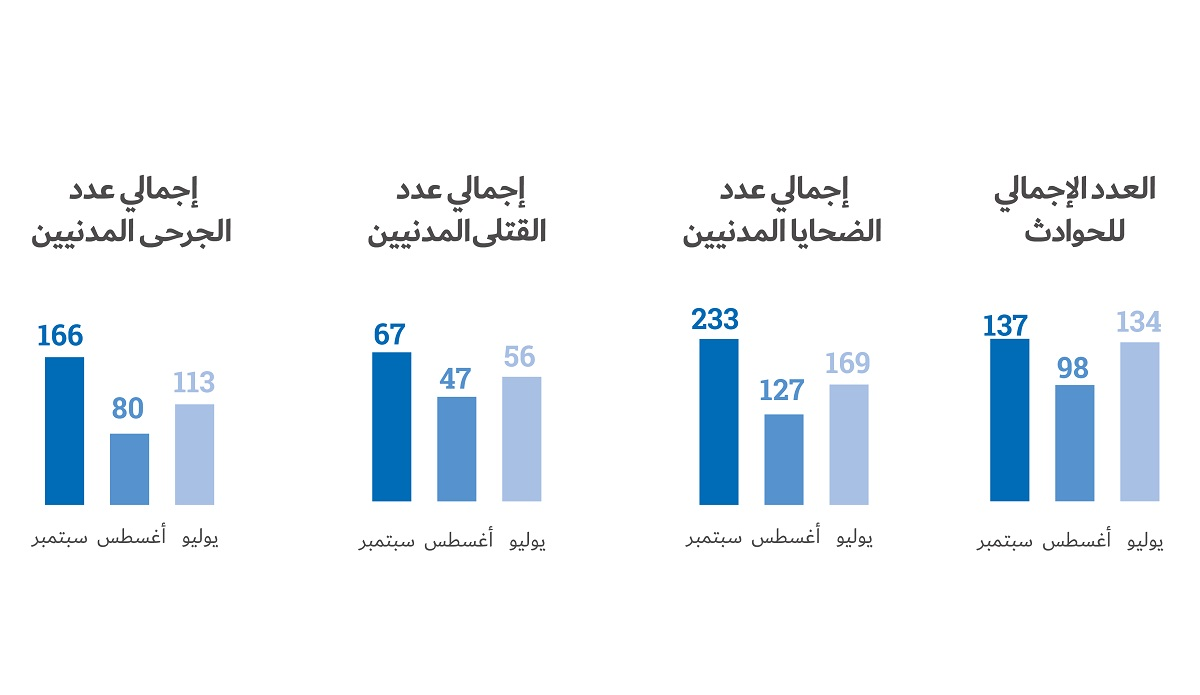 وأشار التقرير إلى احتساب أكبر عدد ضحايا من المدنيين خلال الربع الثالث في شهر سبتمبر الفائت "حيث تم الإبلاغ عن 233 ضحية من المدنيين، بمن فيهم 67 من القتلى، وهو ثاني أعلى عدد إجمالي شهري في كل الحالات خلال هذا العام، في المتوسط نحو ثمان ضحايا مدنيين يوميًا في شهر سبتمبر – وهو ثاني أعلى رقم خلال سنتين".