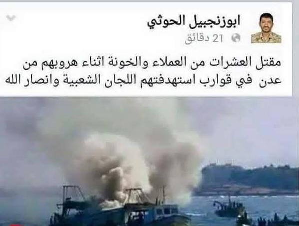 في تصريحات تكشف عن مدى وحشية الإجرام الحوثي، وصف المتحدث باسم الحوثيين محمد عبدالسلام شهداء المجزرة المروعة التي ارتكبتها مليشيات الحوثي والمخلوع علي صالح في ميناء التواهي بعدن، وراح ضحيتها أكثر من 50 نازحًا، بينهم أطفال ونساء، بـ"عناصر القاعدة"!.