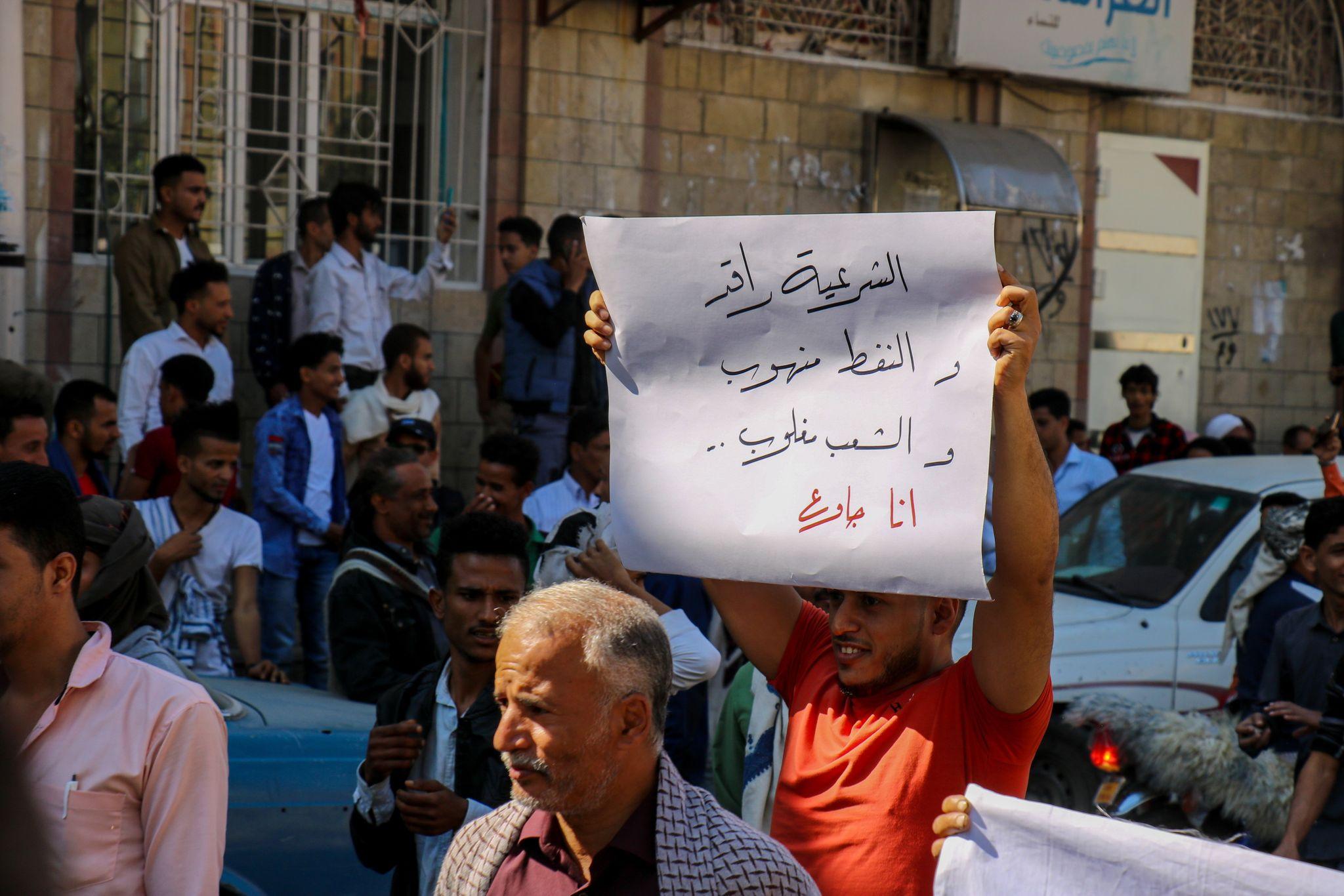 آخر هذه الاحتجاجات مظاهرة شهدتها مدينة تعز يوم أمس حيث خرج المواطنون للتنديد بالجوع ورافعين لافتات يطالبون فيها باسقاط الحكومة، وعمل حلول عاجلة للتدهور الاقتصادي الذي يدفع بالآلاف يومياً إلى خانة المهددين بالجوع وتسبب في تعطيل التعليم وكثير من القطاعات المرتبطة بخدمة المواطنين.