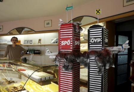 (أثار خباز في فيينا موجة من الغضب بعد أن صنع كعكة تصور الأحزاب الرئيسية في النمسا على انها برجي مركز التجارة العالمي في نيويورك ويتعرضون لهجوم من طائرة تمثل حزب المعارضة.