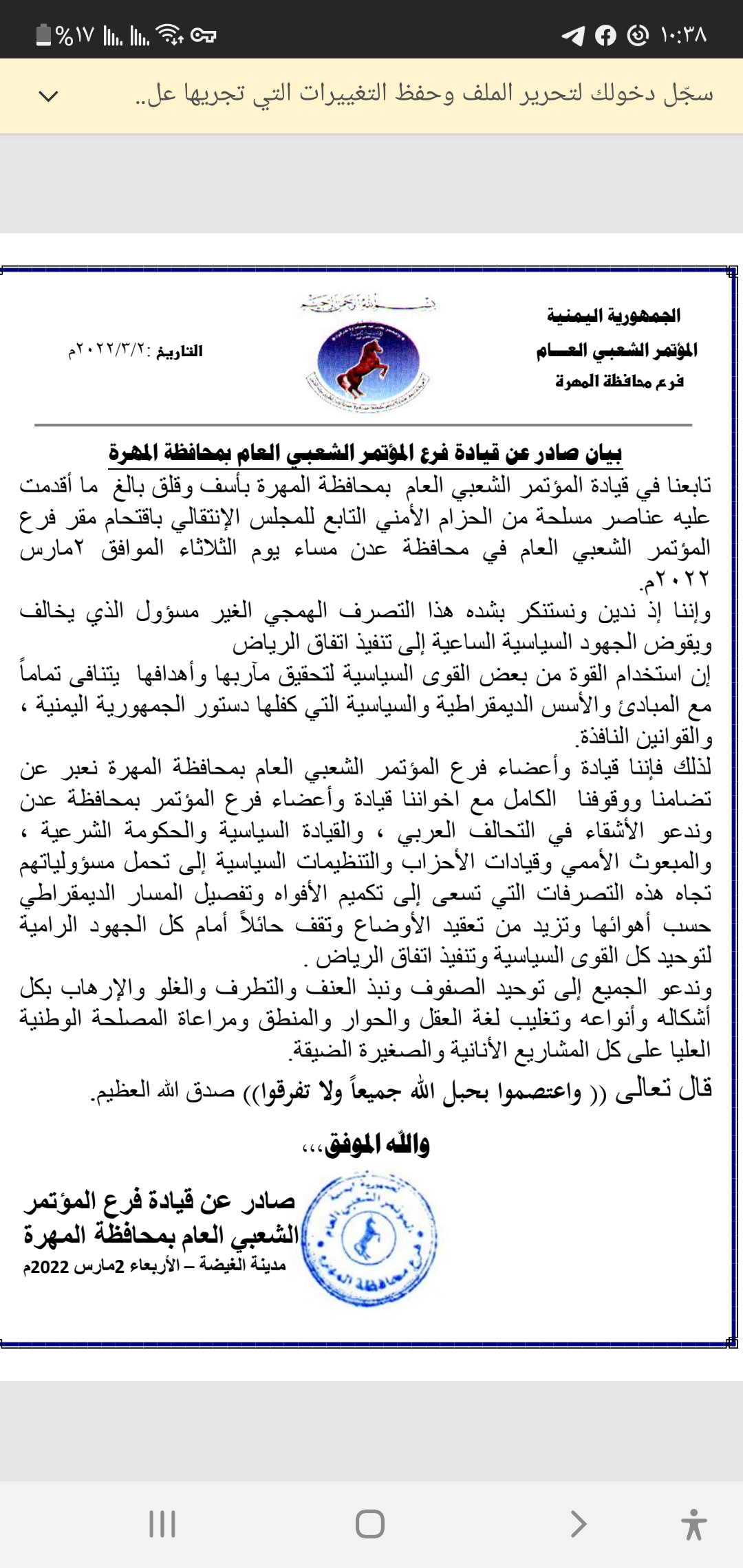 لذلك فإننا قيادة وأعضاء فرع المؤتمر الشعبي العام بمحافظة المهرة نعبر عن تضامنا ووقوفنا الكامل مع اخواننا قيادة وأعضاء فرع المؤتمر بمحافظة عدن وندعو الأشقاء في التحالف العربي , والقيادة السياسية والحكومة الشرعية , والمبعوث الأممي وقيادات الأحزاب والتنظيمات السياسية إلى تحمل مسؤولياتهم تجاه هذه التصرفات التي تسعى إلى تكميم الأفواه وتفصيل المسار الديمقراطي حسب أهوائها وتزيد من تعقيد الأوضاع وتقف حائلاً أمام كل الجهود الرامية لتوحيد كل القوى السياسية وتنفيذ اتفاق الرياض .