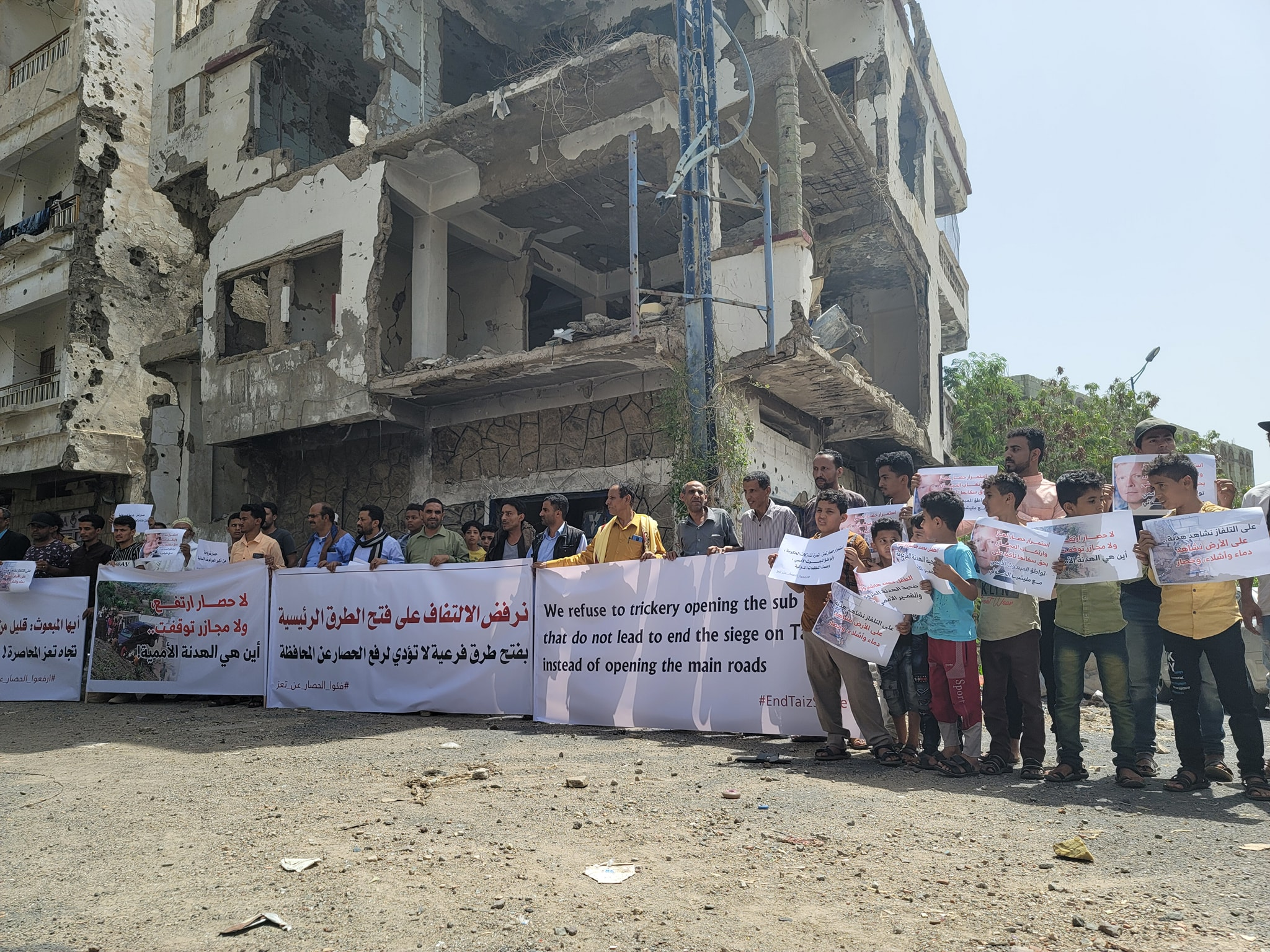 نظم العشرات من أبناء محافظة تعز، صباح اليوم الثلاثاء، وقفة احتجاجية للمطالبة بإنهاء الحصار المفروض على المدينة منذُ سبع سنوات من قبل ميليشيا الحوثي المدعومة من إيران