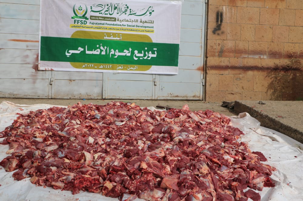 تعز :فجر الأمل توزع لحوم الأضاحي ل2300 أسرة