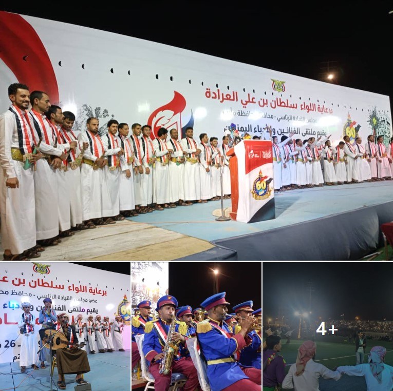 شهدت محافظة مأرب، مساء الثلاثاء، مهرجاناً جماهيرياً فنياً، بمناسبة العيد الوطني الـ 60 لثورة الـ26 من سبتمبر المجيدة، أقامه ملتقى الفنانين والأدباء اليمنيين برعاية عضو مجلس القيادة الرئاسي محافظ مأرب اللواء سلطان العرادة.
