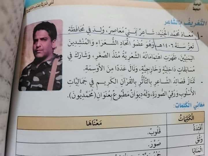 بين محذر ومستهجن ومندد وساخر ومهاجم تداول النشطاء اليمنيين صورة أحد الدروس التي استحدثتها سلطة ميليشيا الحوثي المدعومة من إيران، على المناهج التعليمية في مناطق سيطرتها، حيث قامت الميليشيا هذا العام بإضافة درس يتحدث عن شاعر "معاصر" تابع لها يدعى "معاذ الجنيد"، في منهج اللغة العربية للصف السابع (الجزء الأول).