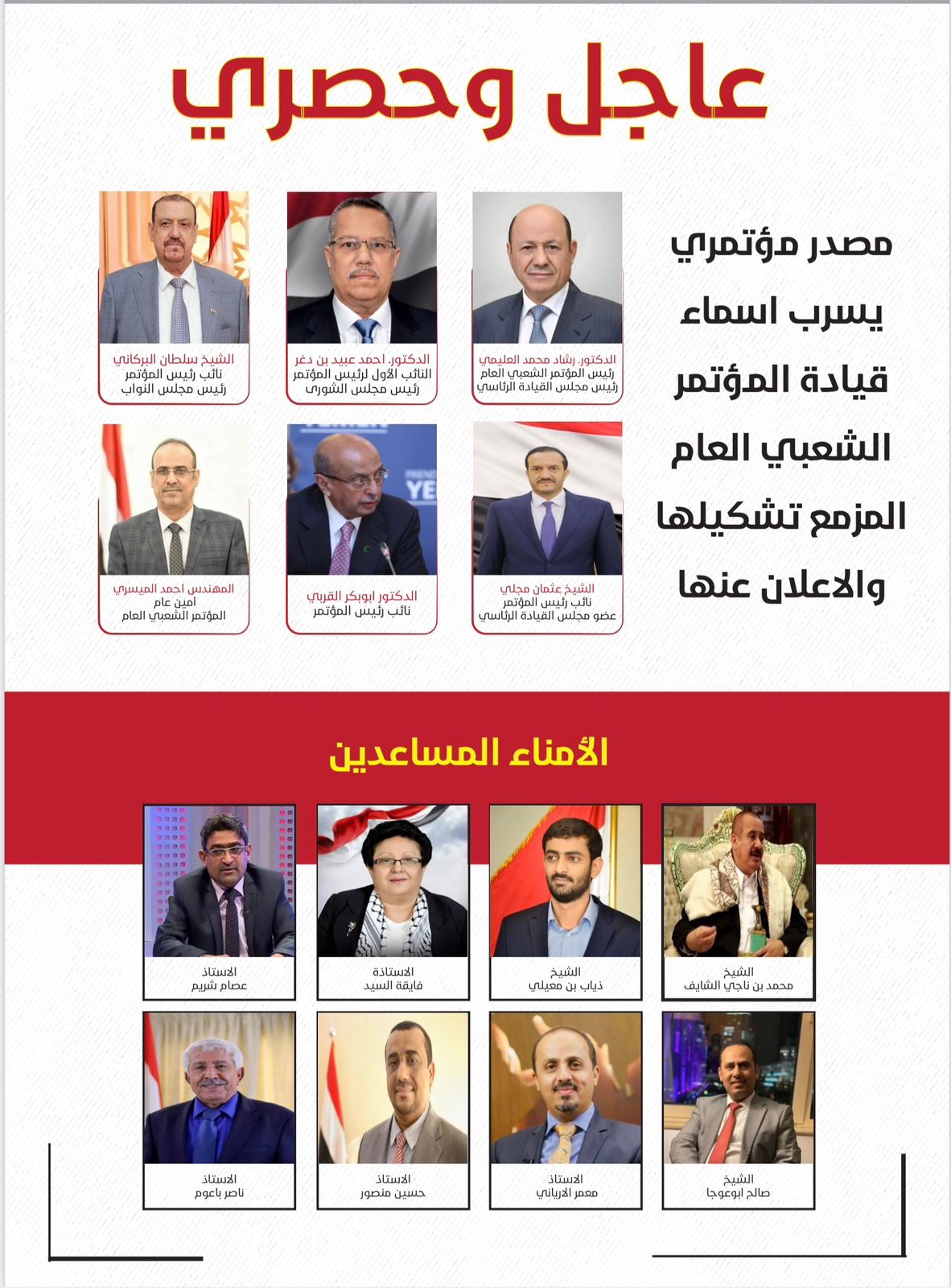 كشف مصدر في حزب المؤتمر الشعبي العام عن الأسماء الجديدة التي تم التوافق عليها لقيادات المؤتمر على مستوى الرئاسة والامانة العامة بعد توافق مؤتمر الداخل والخارج على قائمة الأسماء.