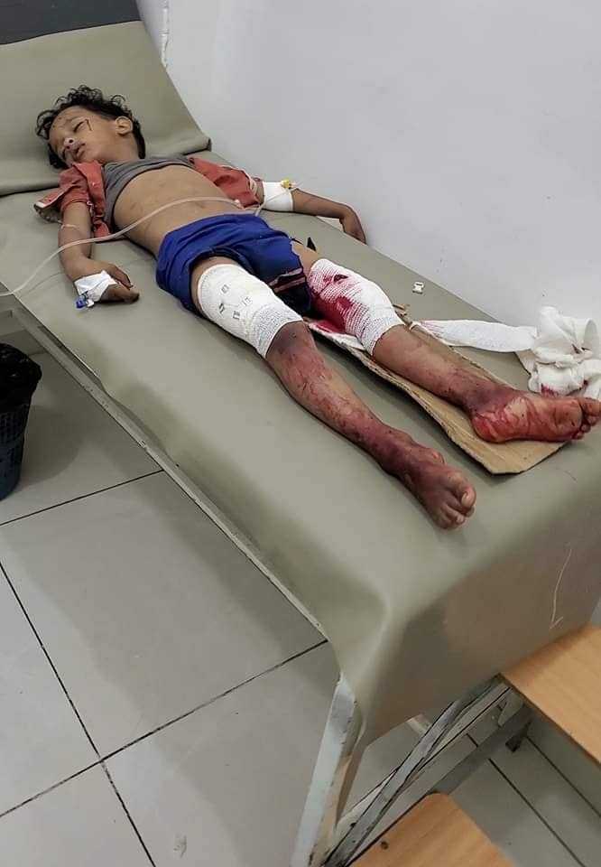 وكان قد أصيب ثلاثة أطفال من أسرة واحدة جراء قذيفة مدفعية حوثية أثناء عودتهم من المدرسة في منطقة المطار القديم، وهم (محمد ناصر المجنحي 10 أعوام بترت رجله، بدر ناصر المجنحي 8 أعوام بترت رجله، هاشم ناصر المجنحي 9 أعوام شظايا بمناطق متفرقة بجسده).