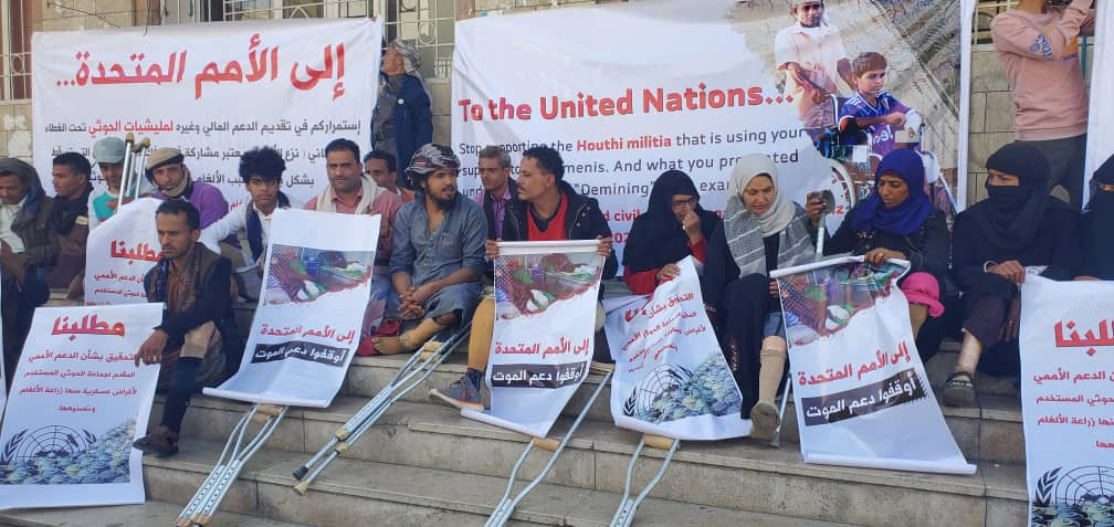 وأكد المحتجّون على أن نزع الألغام والعبوات الناسفة في اليمن لا يمكن أن يتم عبر الأيادي الإجرامية التي زرعتها، وأن من يدعم هؤلاء القتلة يعد شريكًا أساسيًا في سفك دمائنا جراء الألغام والعبوات المتفجّرة التي تحاصرنا في كل تحركاتنا.