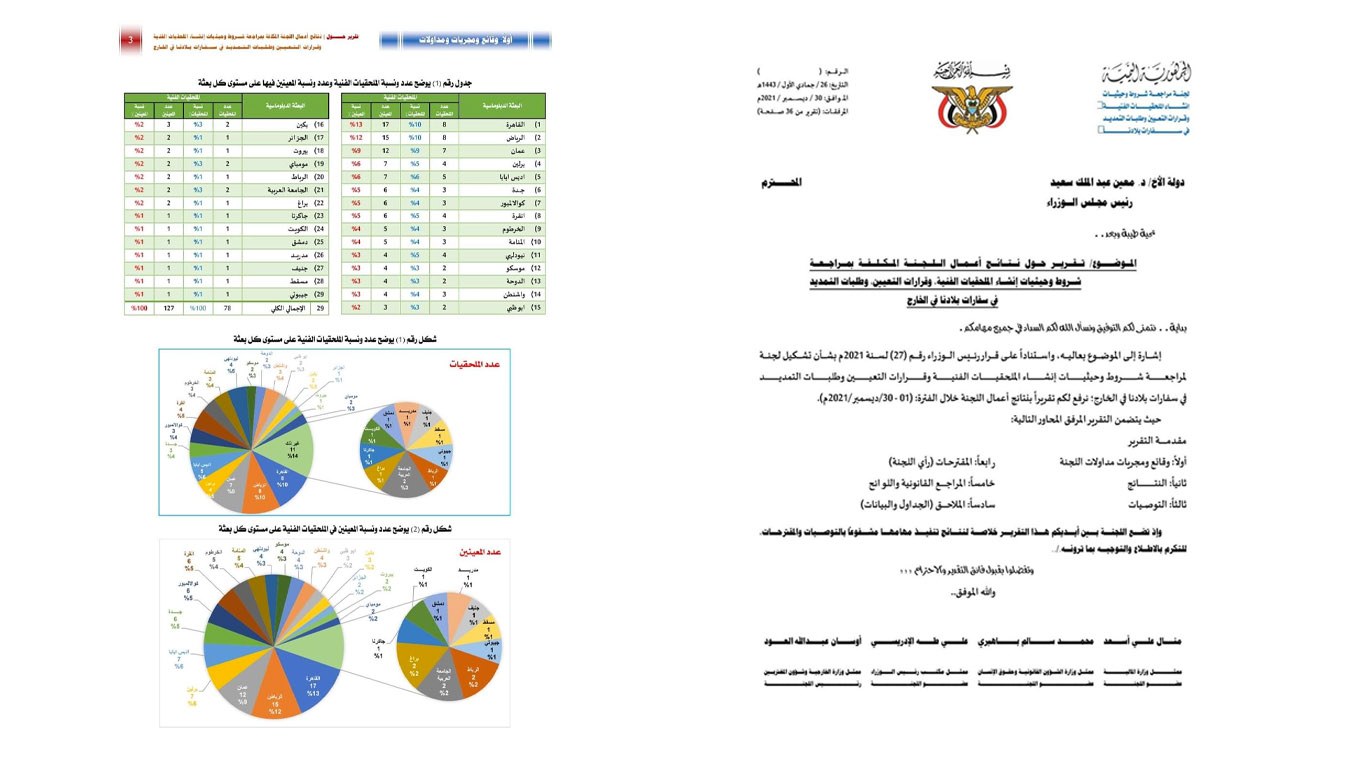 تقرير اللجنة المشكلة بموجب قرار رئيس الوزراء رقم (27) لسنة 2021م، أكد "أن أغلب الموظفين المعينين في الملحقيات الفنية انتهت فترة عملهم القانونية والمحددة بأربع سنوات حسب قانون السلك الدبلوماسي والقنصلي والبعض قد تجاوز هذه المدة إلى ما يزيد عن 14 سنة".