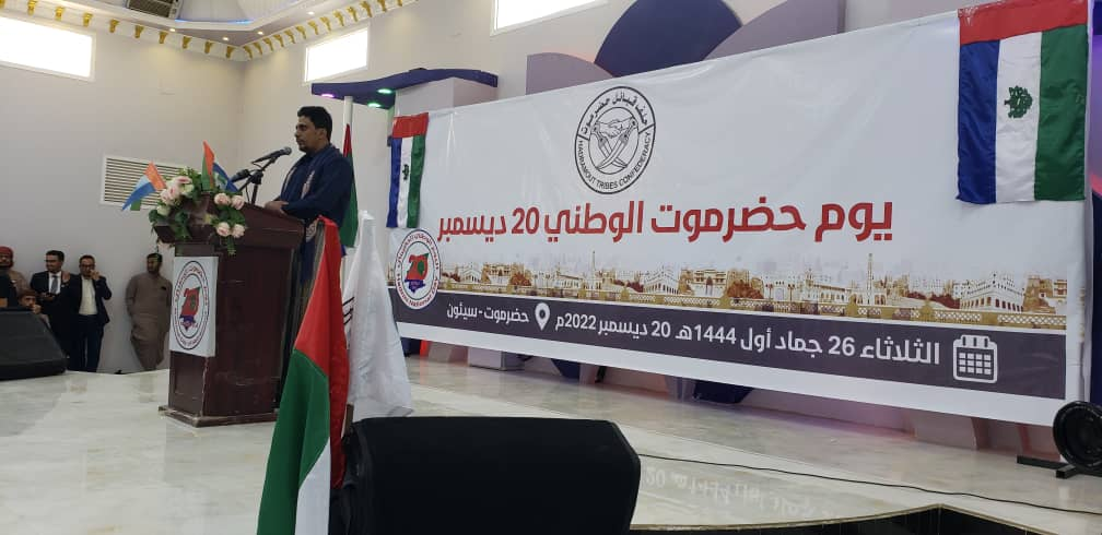 وأضاف: "لن نتخفى بعد اليوم فعلمنا وهويتنا حضرمية ولن نرضى بعد اليوم بإقليم فقط بل نعلنها نطالب حضرموت دولة حرة مستقل"، "اليوم ننطلق في الطريق الذي لابد أن نصل عبره إلى تحقيق الغاية المنشودة، علينا أن نمد الجسور لماضي المشرق لحضرموت ليكون حاضرا لنا الآن".