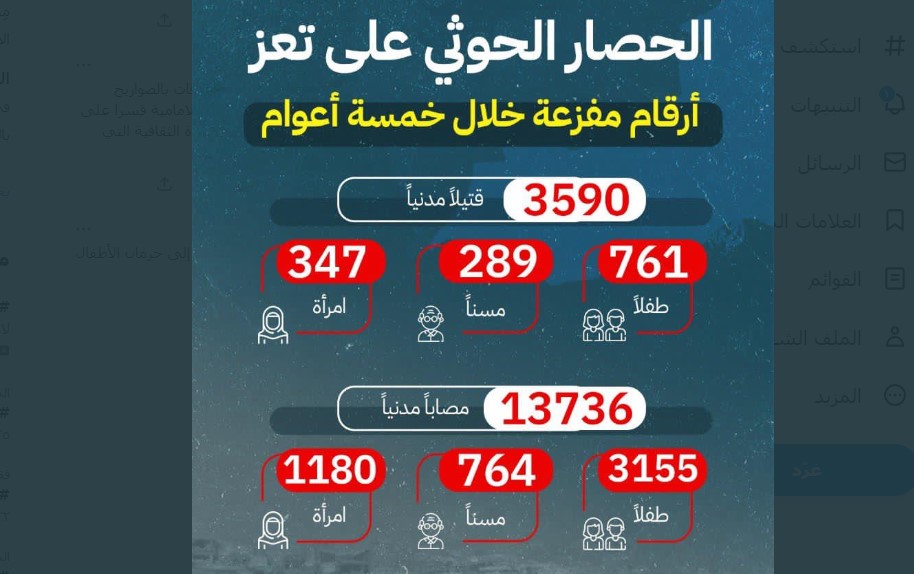 وقالت الإعلامية عفاف ثابت "إن استهداف مليشيا الحوثي للأحياء والحدائق والأماكن العامة والطرقات بالصواريخ والمسيرات الايرانية كلها تعد من أشكال الحصار التي تضيق على الناس حياتهم".