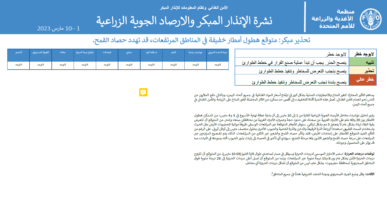 وأضافت: يشير تحليل مؤشر مخاطر الأرصاد إلى أمكانية هطول الأمطار بين ٢٠و٤٠ ملم على الأجزاء الغربية من صعدة، وحدود محافظات حجة وعمران، والأجزاء الغربية من محافظتي صنعاء وذمار. ومن المتوقع أن تتعرض بقية البلاد لرذاذ بشكل عام يتجاوز ٥ملم بشكل تراكمي".