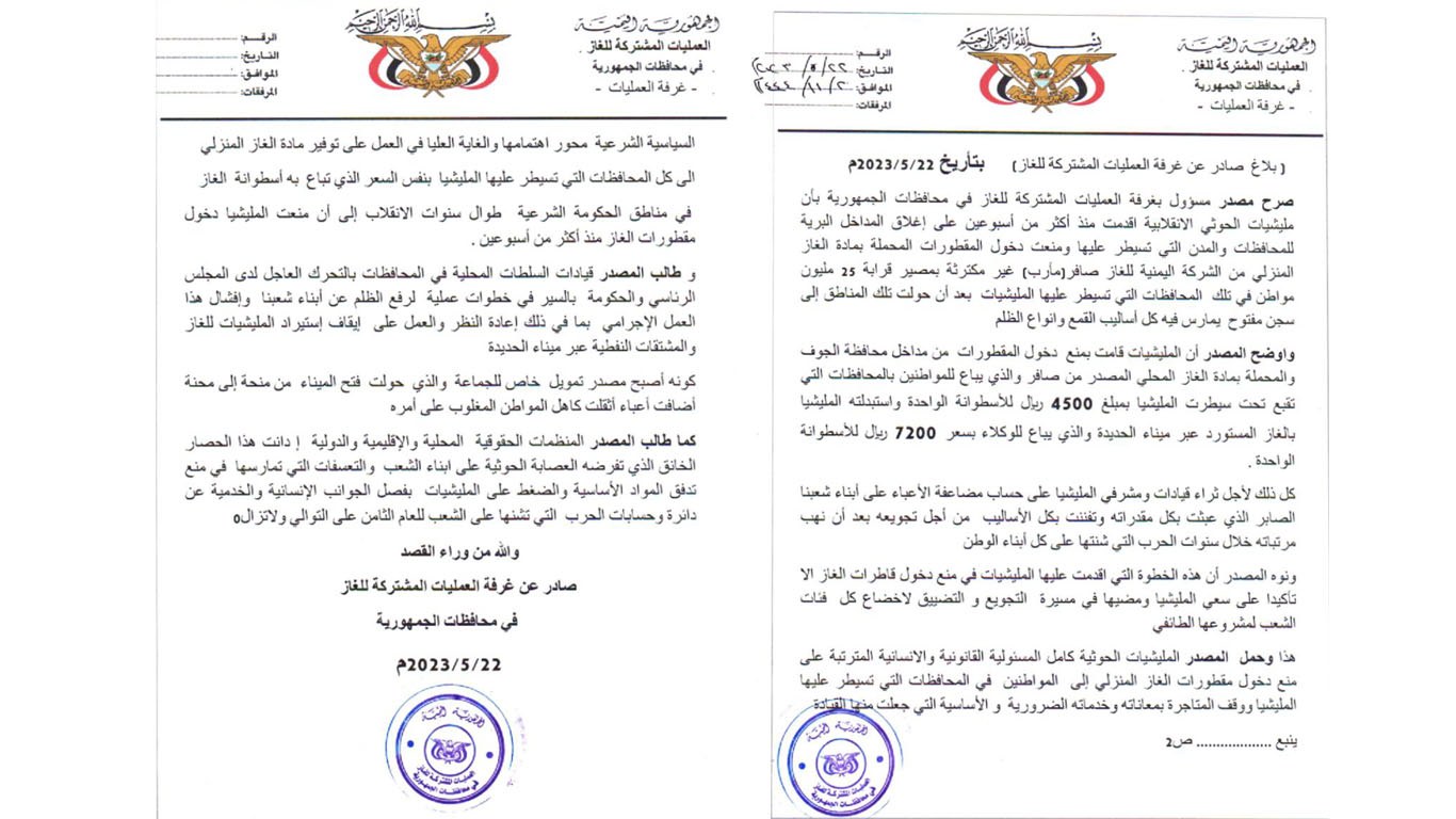 وقال مصدر مسؤول في غرفة العمليات المشتركة للغاز إن "مليشيا الحوثي الانقلابية أقدمت منذ أكثر من أسبوعين على إغلاق المداخل البرية للمحافظات والمدن التي تسيطر عليها ومنعت دخول المقطورات المحملة بمادة الغاز المنزلي من الشركة اليمنية للغاز صافر (مارب) غير مكترثة بمصير قرابة 25 مليون مواطن في تلك المحافظات التي تسيطر عليها بعد أن حولت تلك المناطق إلى سجن مفتوح يمارس فيه كل أساليب القمع وأنواع الظلم".