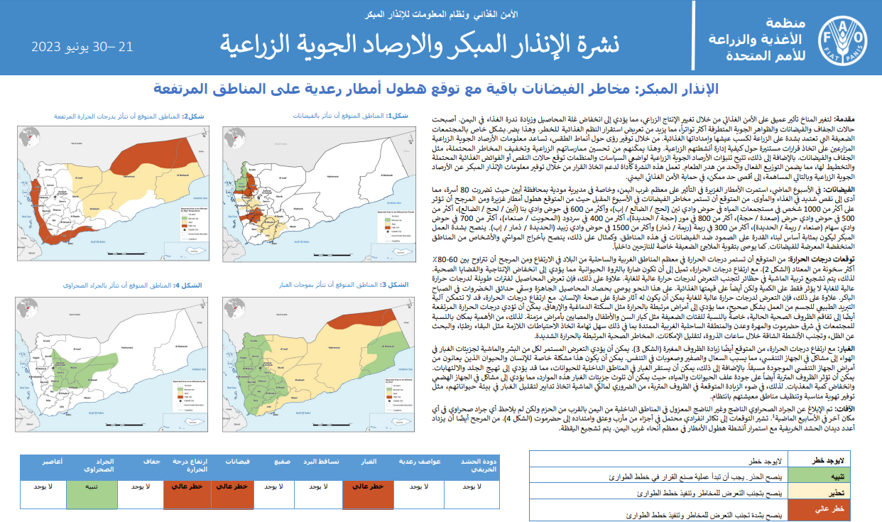 وطالبت الأمم المتحدة في نشرة الإنذار المبكر الصادرة عن منظمة الفاو، بالاستعداد في هذه المناطق للفيضانات والعمل على إخراج المواشي والأشخاص من المناطق المنخفضة المعرضة للفيضانات وتقوية الملاجئ الضعيفة خاصة للنازحين داخلياً