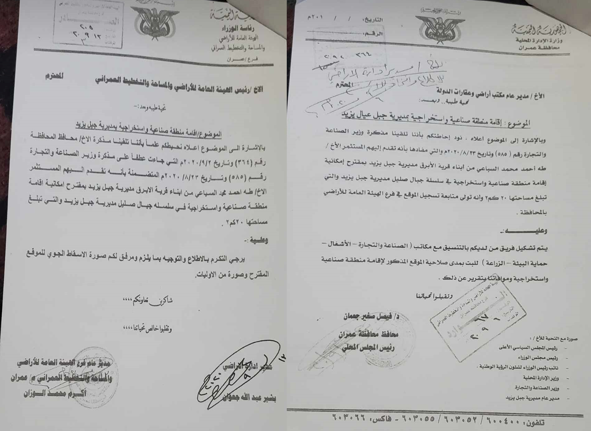 فيما تظهر بقية الوثائق الإجراءات التي سلكها المدعو طه السباعي وهو قيادي حوثي من أبناء منطقة الأبرق، من أجل طلب استئجار الأرض والاستثمار فيها، وهي مذكرات موجهة من مدير عام مديرية جبل يزيد، إلى مدير عام أراضي وعقارات الدولة بالمحافظة، وأخرى من المحافظ فيصل جعمان لمدير الأراضي نفسه، إضافة إلى رسالة وجهها الأخير إلى مدير عام الأراضي في مناطق سيطرة الميليشيا.