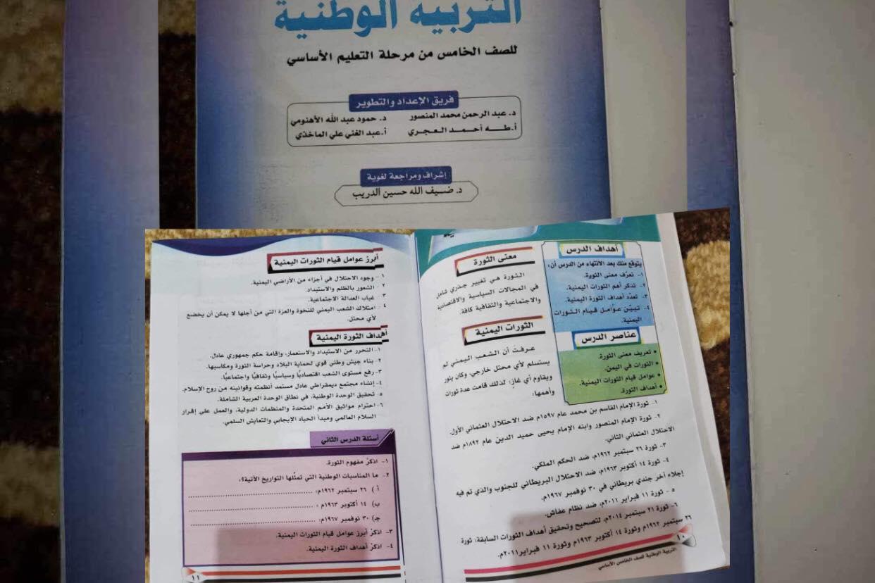 واطلع "المصدر أونلاين" على كتاب التربية الوطنية للصف الخامس من التعليم الأساسي، والذي حذفت الميليشيا منه الشطر المذكور من هدف الثورة الأول، بينما ينص الهدف قبل تعديله على "التحرر من الاستبداد والاستعمار ومخلفاتهما وإقامة حكم جمهوري عادل وإزالة الفوارق والامتيازات بين الطبقات".