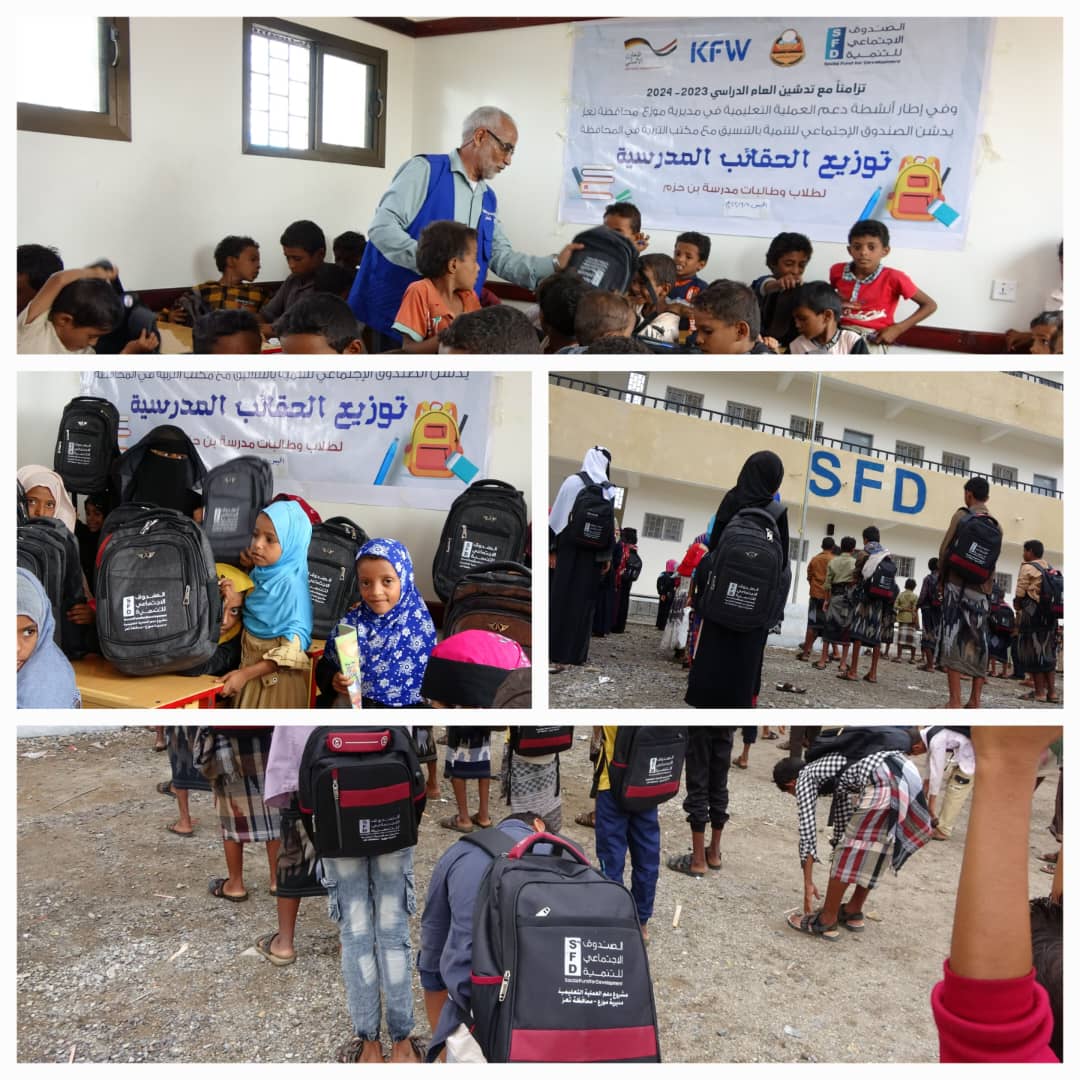 في أطار أنشطة دعم العملية التعليمية وتزامننا مع تدشين العام الدراسي الجديد نفذ فرع الصندوق الاجتماعي بتعز توزيع الحقائب المدرسية في مديرية موزع في مدرسة بالسفالية ومدرستين في الهاملي لعدد 1195 طالب وطالبة مع وسائل تعليمية لنفس المدارس ومدارس مجاورة بمنحة من الحكومة الألمانية لبرنامج المساواة في الحصول على التعليم ضمن أنشطة مشروع دعم العلمية التعليمية وتدريب الكوادر التربوية في عزلتي موزع والاهمول بتعز