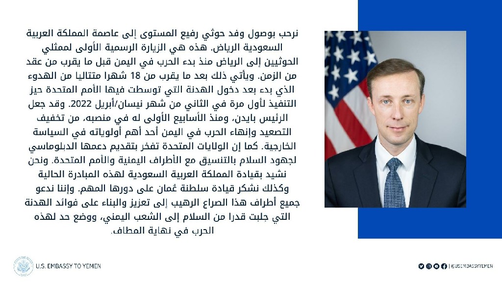وقال مستشار الأمن القومي جيك سوليفان، إن بلاده "ترحب بوصول وفد حوثي رفيع المستوى إلى عاصمة المملكة العربية السعودية الرياض"، مشيرا الى أن "هذه هي الزيارة الرسمية الأولى لممثلي الحوثيين إلى الرياض منذ بدء الحرب في اليمن قبل ما يقرب من عقد من الزمن".