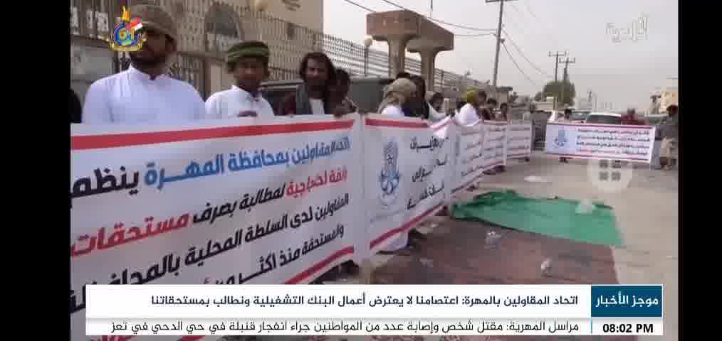 يواصل مقاولو محافظة المهرة احتجاجهم للأسبوع الثاني على التوالي وذلك للمطالبة بحقوقهم