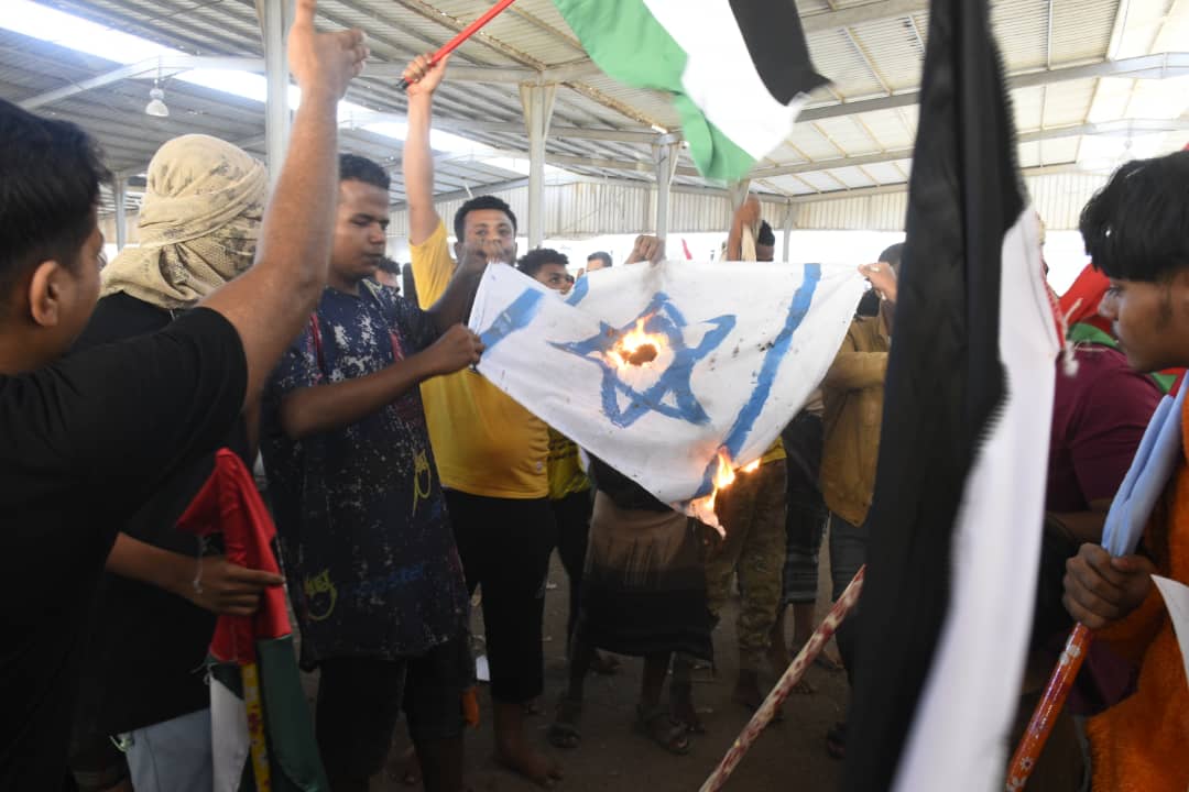 وخلال المسيرة التي اقيمت في منطقة الهاشمي بمديرية الشيخ عثمان بعدن عبر المحتجون عن تضامنهم الكامل مع الشعب الفلسطيني وحقه في نيل حريته واستقلال اراضيه وطرد الاحتلال الاسرائيلي جميع الاراضي الفلسطينية .
