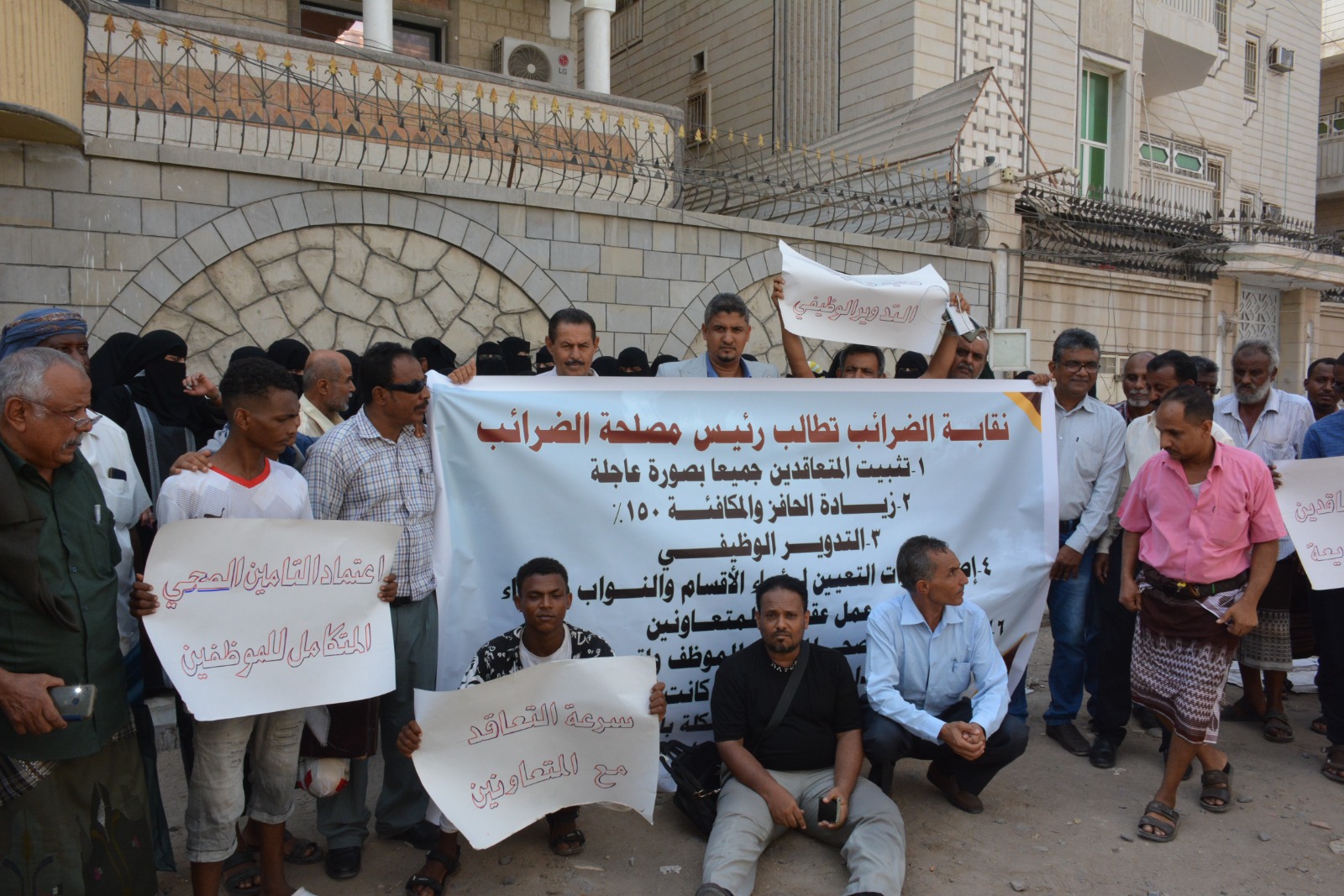 وطالب المحتجون مصلحة الضرائب تثبيت المتعاقدين بصورة سريعة حيث صدر لهم حكم قضائي بتثبيتهم من المحكمة الإدارية عدن ورفع رواتبهم أسوة بزملائهم في المحافظات وزيادة الحافز والمكافاة بنسبة 150 فوق الراتب الأساسي اضافة الى إعادة صرف بدل المواصلات التي كانت تصرف قبل حرب 2015م وزيادتها بما يتناسب مع الوضع الحالي .