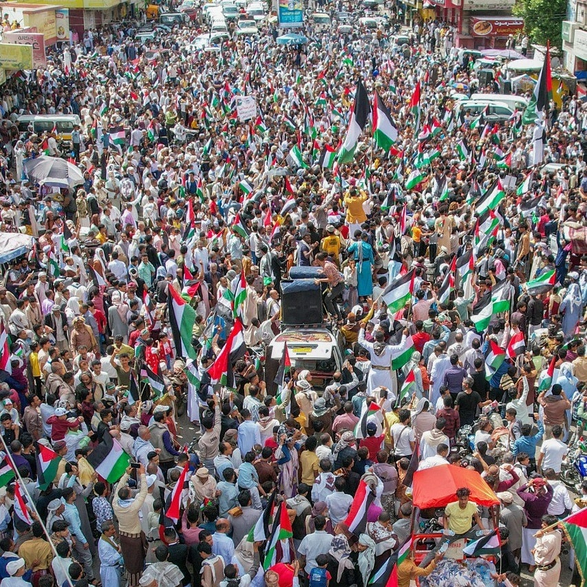 وفي محافظة تعز، تظاهر الالاف تنديداً بجرائم الابادة الجماعية التي يرتكبها الإحتلال الإسرائيلي بحق المدنيين ومحاولته تهجيرهم بالقوة من القطاع .