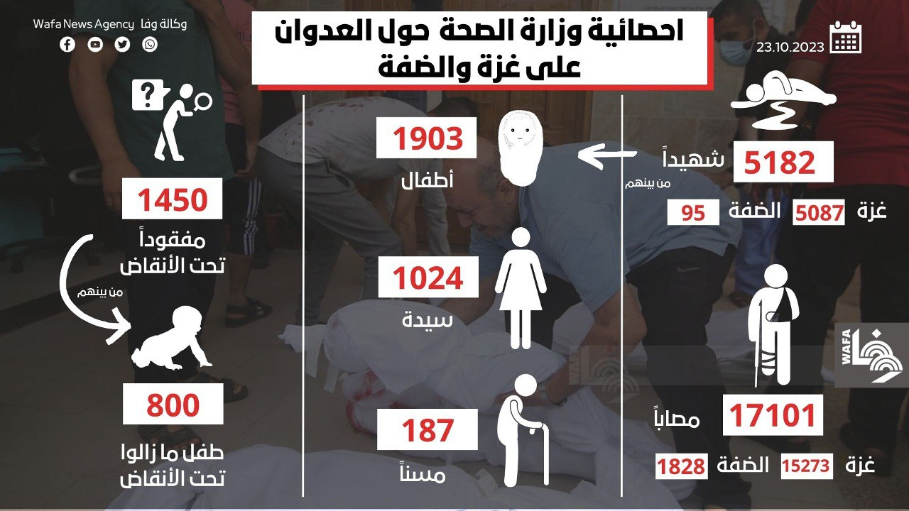 وقالت الوزارة في أحدث بياناتها، اطلع المصدر أونلاين على مضمونه، إن حصيلة الضحايا المدنيين جراء العدوان الإسرائيلي الوحشي المستمر على قطاع غزة، ارتفع إلى 5087 شهيدا، و15,273 جريحاً، 70 في المائة منهم من النساء والأطفال والمسنين.