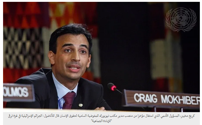كريغ مخيبر كان أعلن في نهاية الشهر الماضي استقالته من منصبه بعد 32 عامًا من العمل في الأمم المتحدة بسبب عدم إظهار المنظمة الدولية استجابة كافية تجاه التطورات في فلسطين.