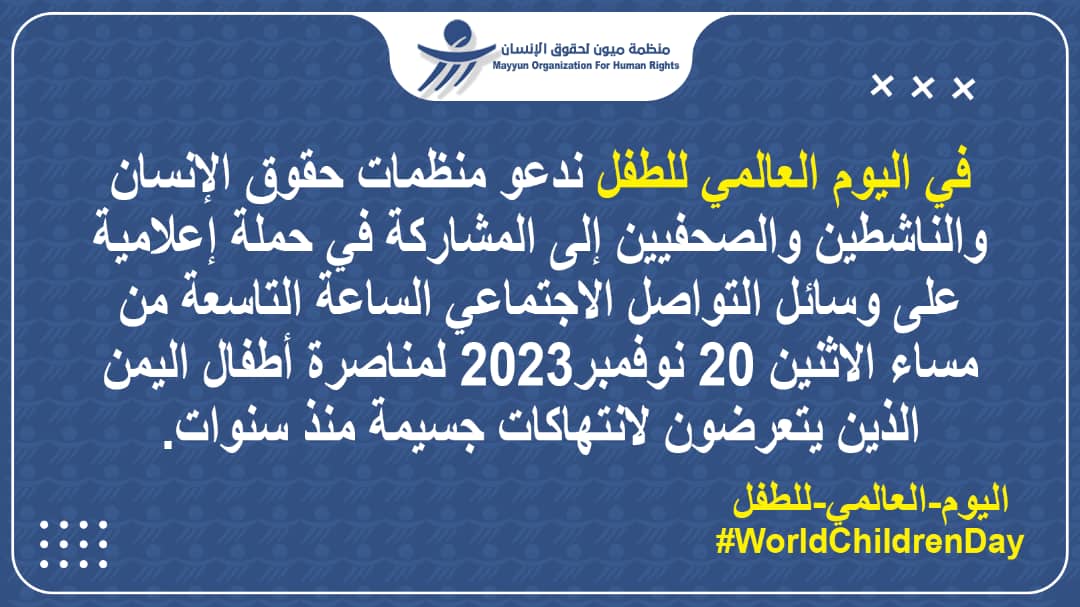 دعت منظمة ميون لحقوق الإنسان لمناصرة أطفال اليمن ضحايا الانتهاكات الجسيمة، وذلك بمناسبة اليوم العالمي للطفل الذي يقام في العشرين نوفمبر من كل عام.