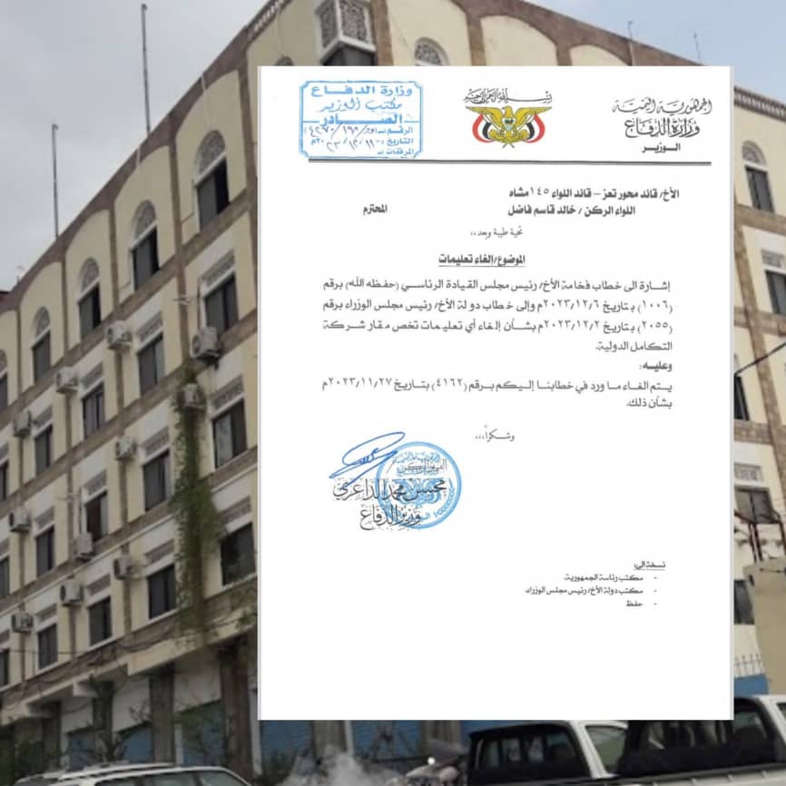 وطالبت مذكرة وزير الدفاع " محور تعز بعدم التعامل مع أي تعليمات سابقة بشأن مقار شركة التكامل الدولية (تابعة للشيباني) وذلك استنادا إلى خطاب من رئيس مجلس القيادة الرئاسي رشاد العليمي".