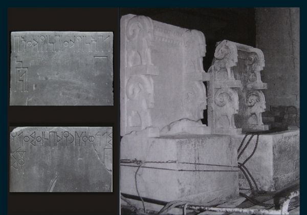 وأوضح أن العرش الأول هو لعرش الملك (لبأن يدع بن يدع أب)، وبحسب مدونة النقوش "العرش مصنوع من كرسي ضخم ذو ظهر مرتفع، ويزين الظهر سلسلة من الوعول موضوعة على شكل مرآة، اثنتان لكل جانب؛ وتقف الحيوانات المصممة على أقواس بارزة، ولها قرون كبيرة منحنية، وآذان طويلة، ولحى مستطيلة، وأرجل وحوافر مميزة. في الجزء العلوي، تم تأطير الجزء الخلفي بسلسلة مزدوجة من الأخاديد الأفقية والبروزات المربعة (17 للسلسلة العلوية، و15 للسلسلة السفلية)".