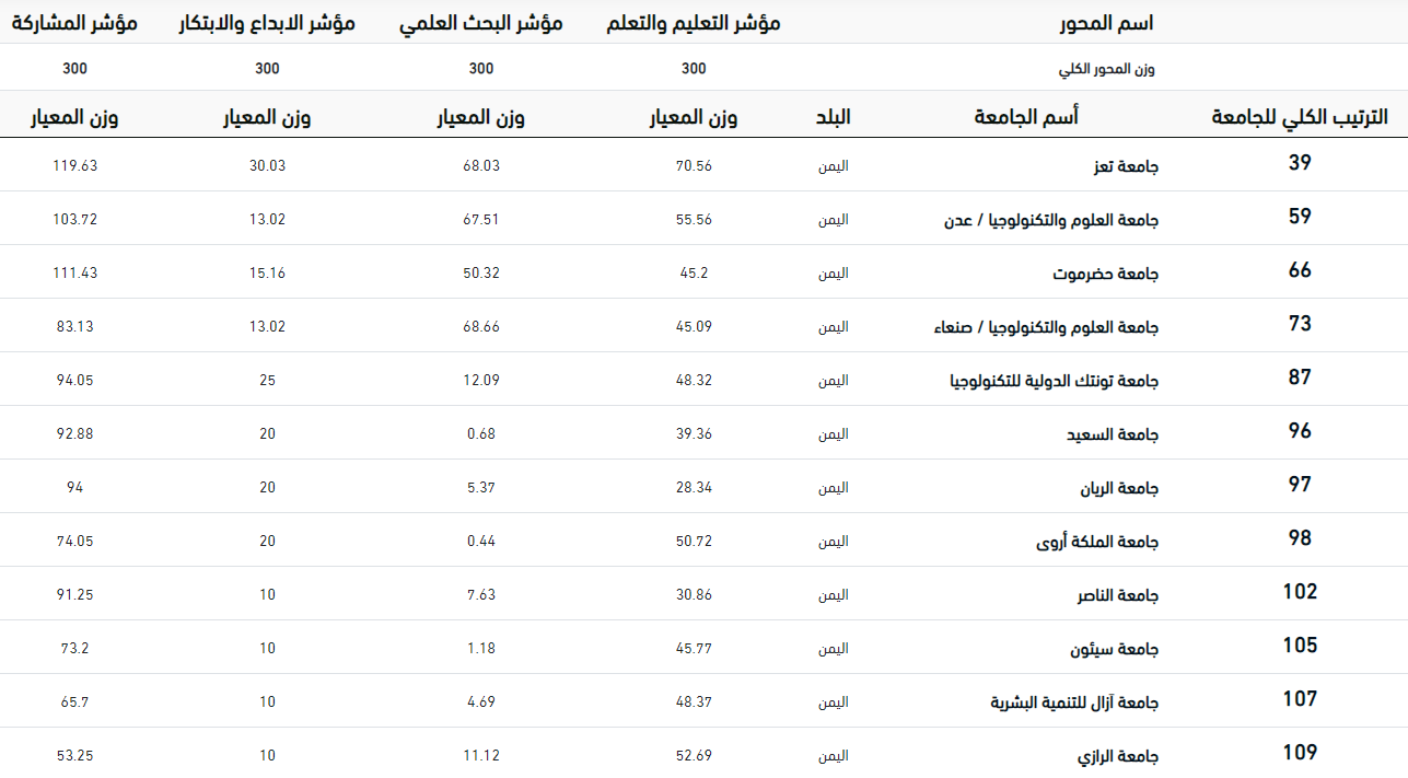 وشاركت في التصنيف 12 جامعة يمنية، وجاء ترتيب تلك الجامعات كالتالي: تونتك الدولية للتكنولوجيا (87 عربيا)، السعيد (96)، الريان (97)، الملكة أروى (98)، الناصر (102)، سيئون (105)، أزال للتنمية البشرية (107)، الرازي (109 عربيا).