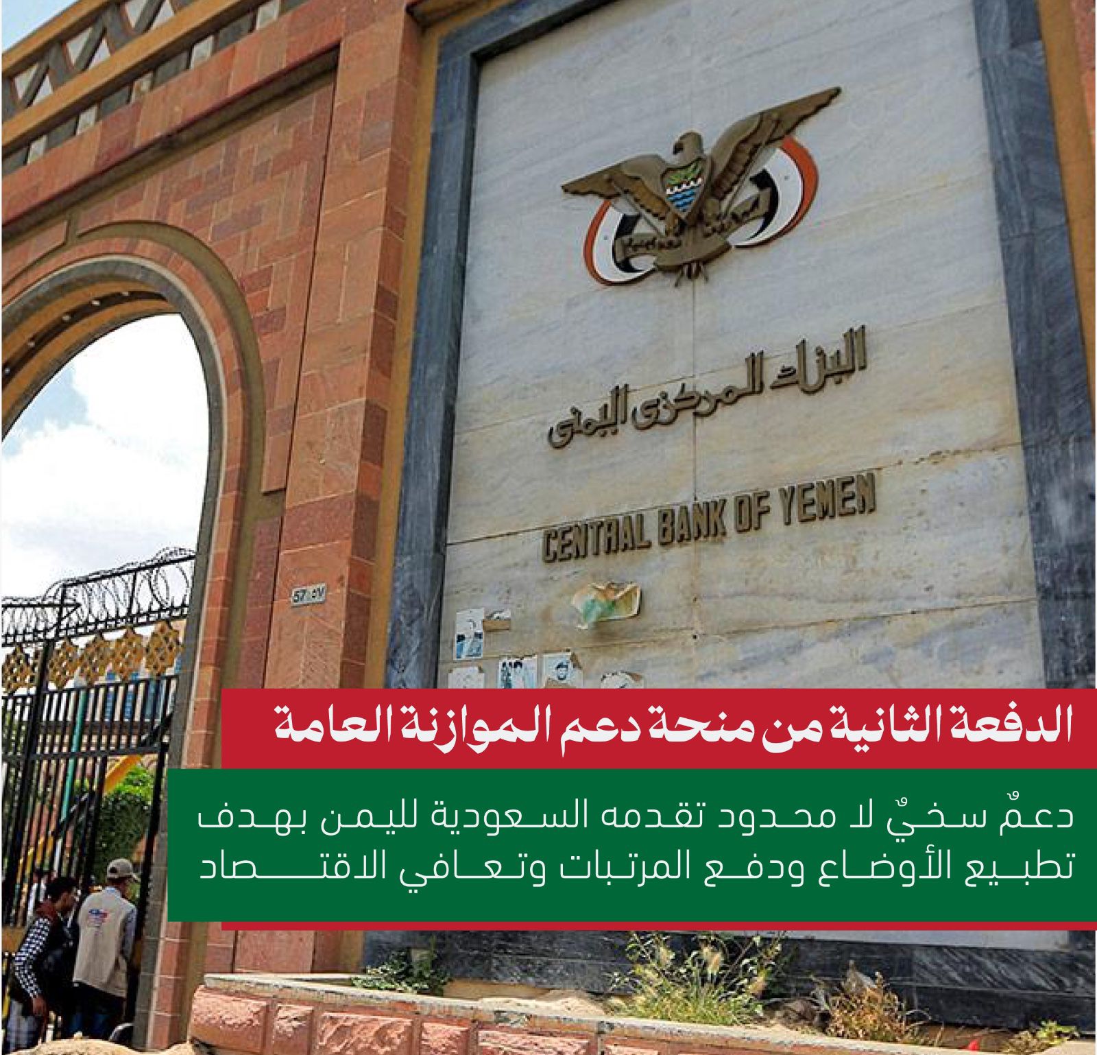 أعلنت المملكة العربية السعودية اليوم الأحد إيداع الدفعة الثانية من دعم معالجة عجز الموازنة لدى الحكومة اليمنية بقيمة 250 مليون دولار أمريكي من إجمالي الدعم البالغ 1.2 مليار دولار، دعماً للإصلاحات الاقتصادية التي قامت بها الحكومة اليمنية.