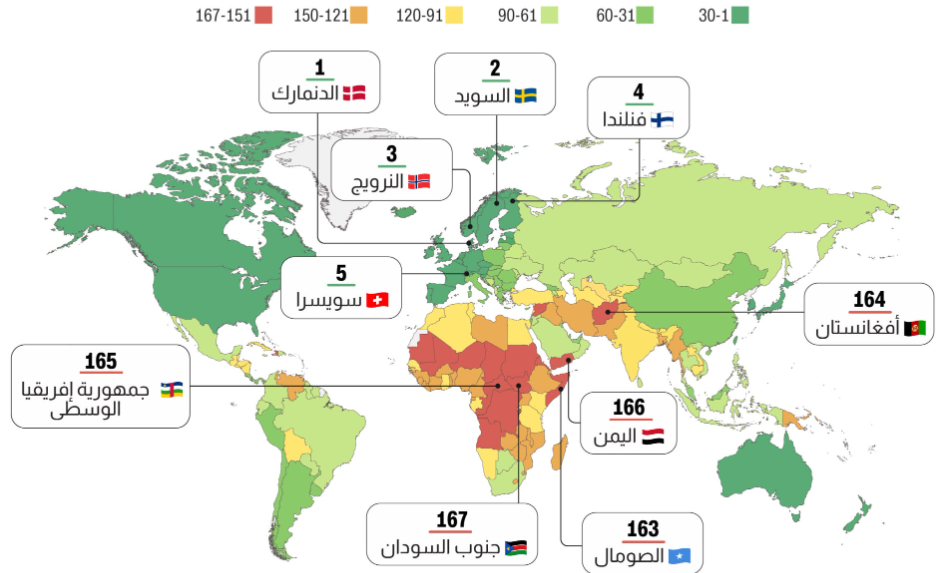 أما الدول التي جاءت في ذيل المؤشر هي: جنوب السودان (167)، اليمن (166)، جمهورية إفريقيا الوسطى (165)، أفغانستان (164).